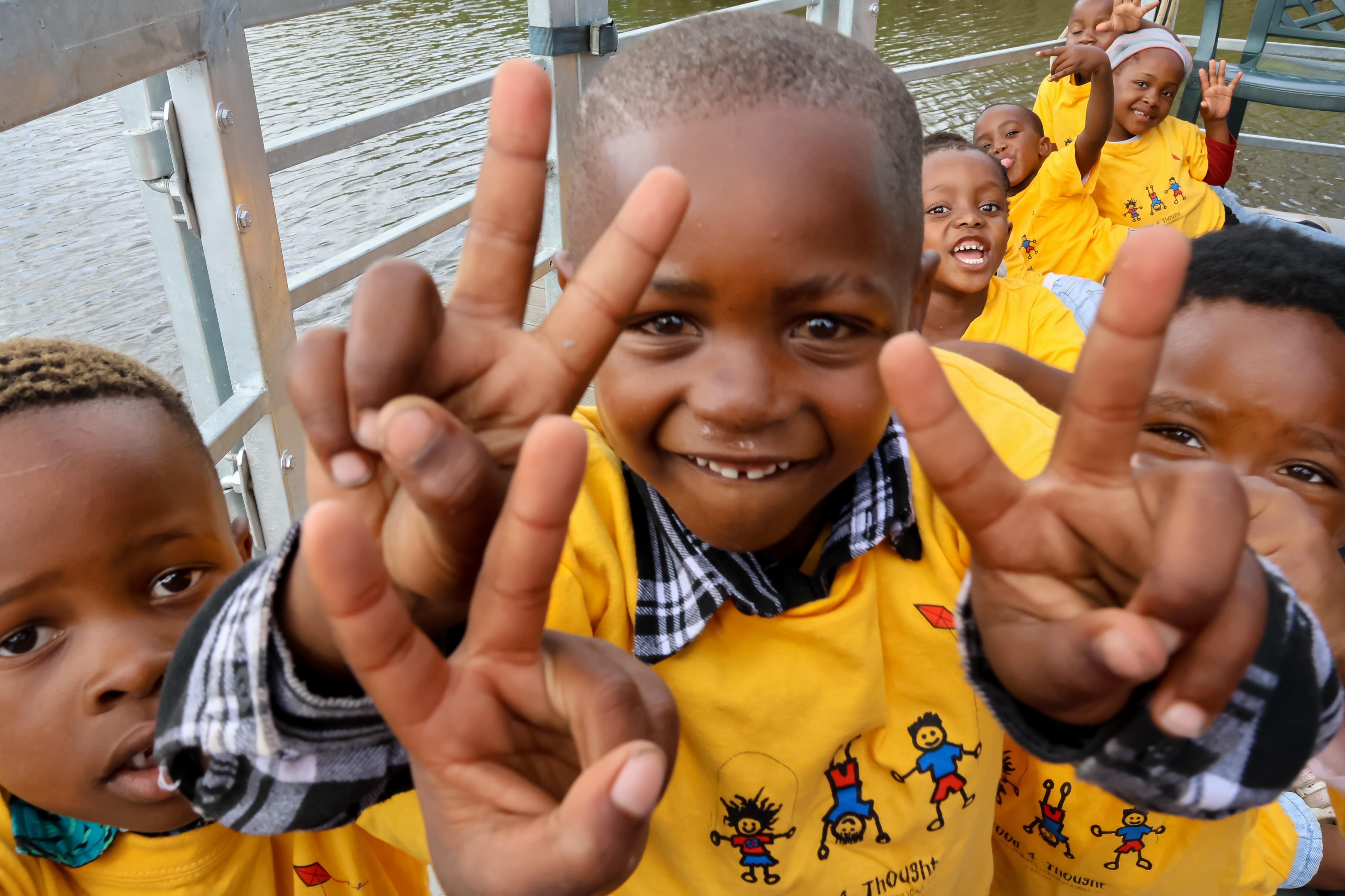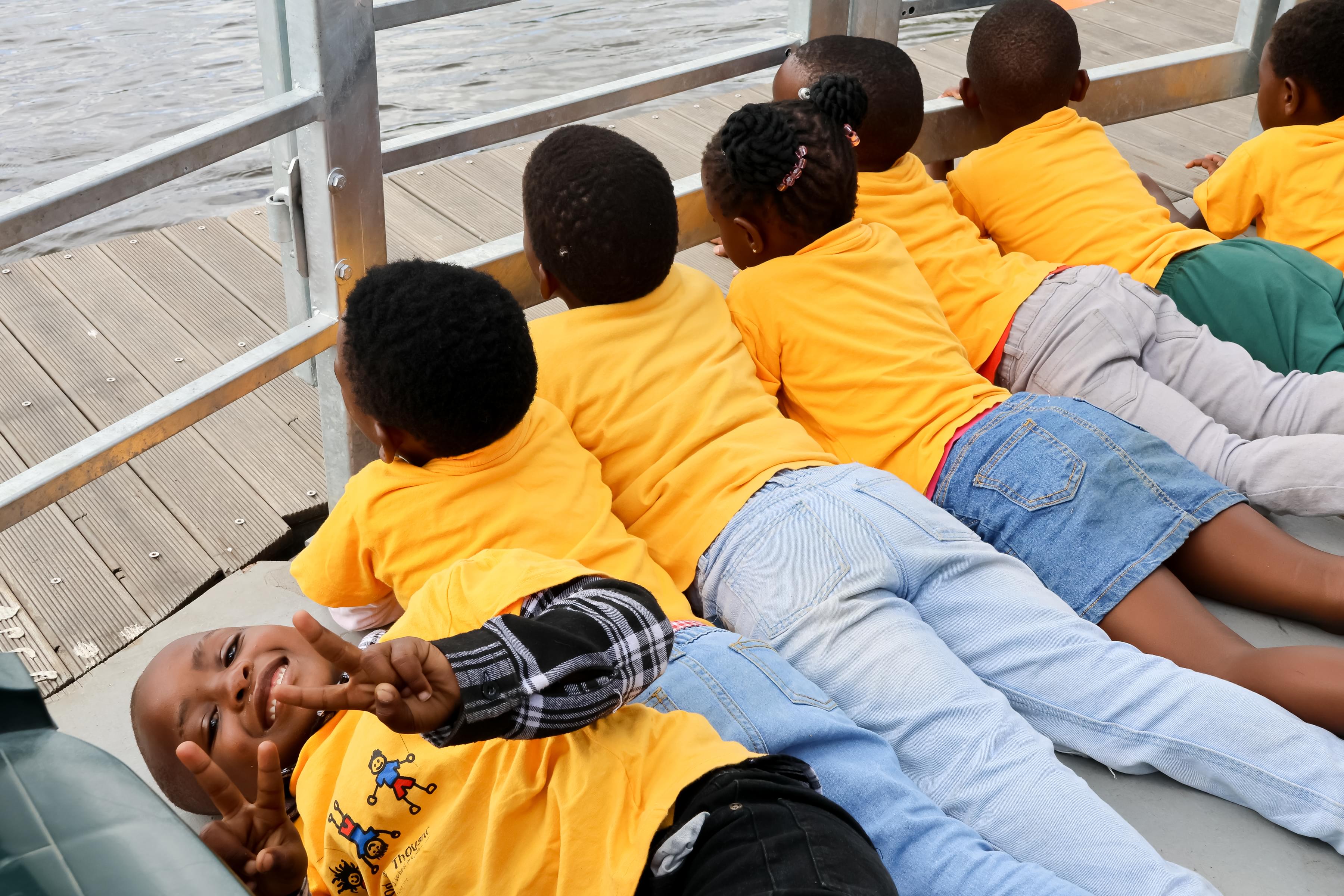 Roland brachte die Kinder mit dem Bus, und dann ging es los. Sieben Erwachsene, darunter die Lehrerin Nandipha sowie Maryanne und Roland, die Food4Thought Südafrika leiten, fuhren mit und passten auf, dass niemand ins Wasser fiel. Zwischendurch gab es ein Frühstück mit belegten Broten, Keksen und Saft. Die Kinder hatten viel Spaß, beobachteten die Tiere am und im Wasser und posierten gerne für Bilder. Hier eine kleine Auswahl.