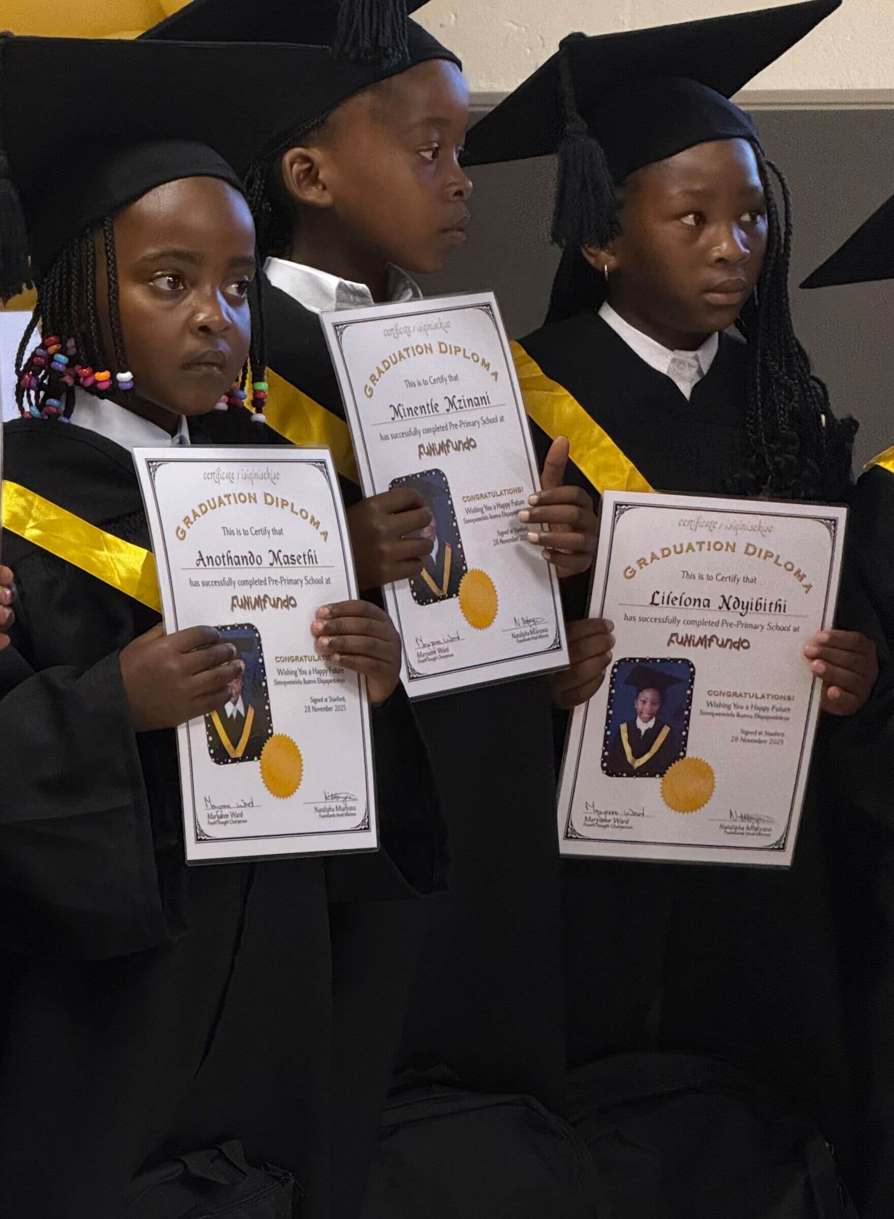 Am 28. November 2025 fand die diesjährige Graduation Ceremony in Funimfundo statt. Wie immer war ein Klasseraum zum Festsaal umfunktioniert und schön hergerichtet. In der einen Hälfte des Raumes saßen die Eltern, überwiegend Mütter, aber auch einige Väter, und die Kinder der anderen Klassen. Die andere Hälfte war leer, was zunächst verwunderte und etwas Neues erwarten ließ. Und tatsächlich gab es zwei überraschende Neuerungen.