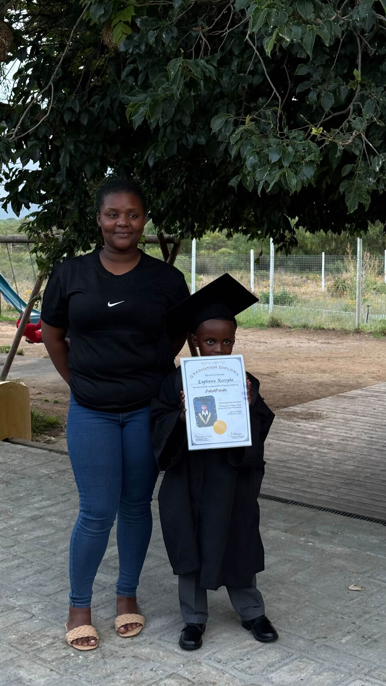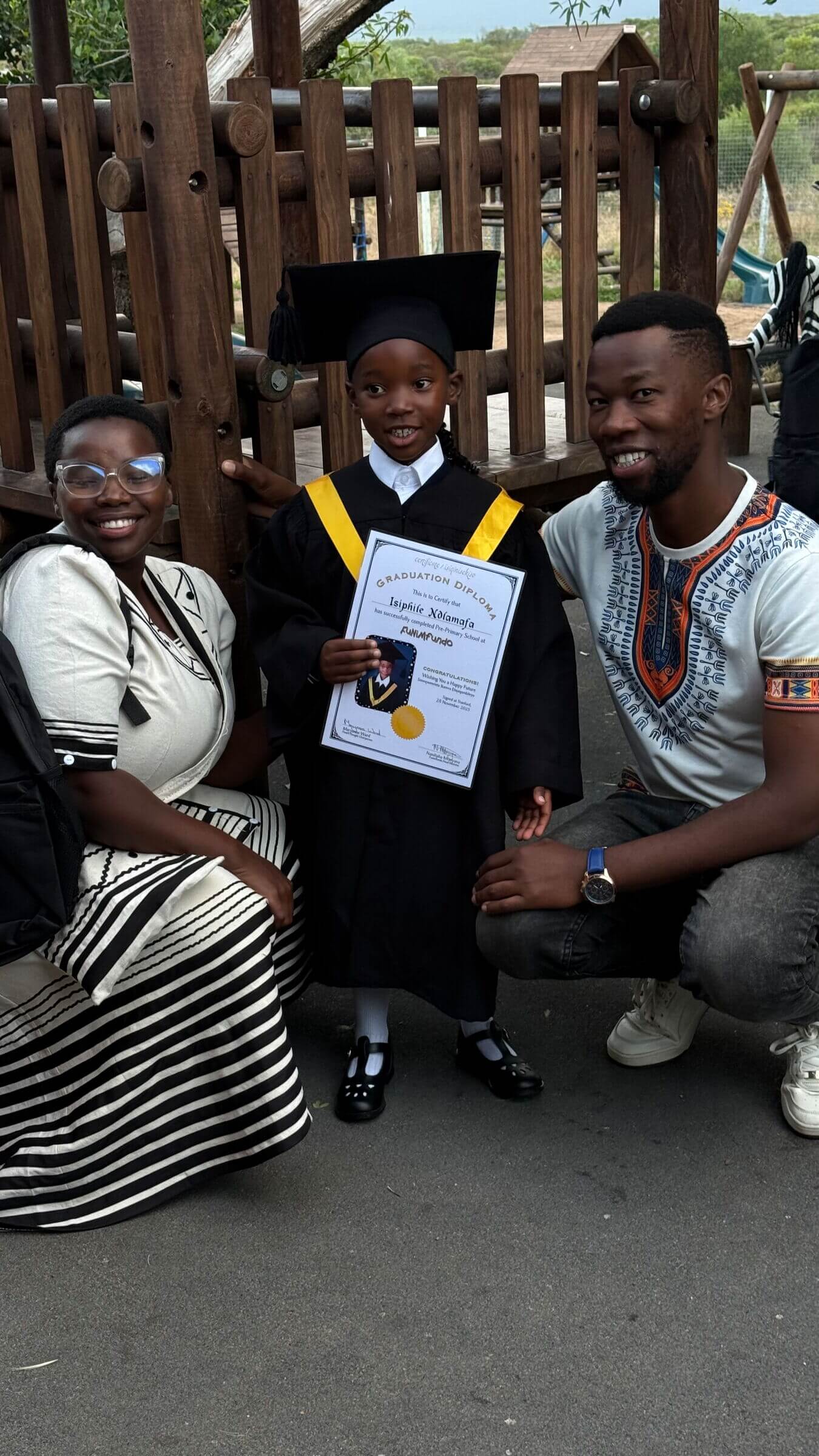 Anschließend kam der zeremonielle Teil. Alle Graduierten zogen wieder ein, aber nun, wie Nandipha, so wie wir es aus den letzten Jahren kennen: in Talar und mit Doktorhut. Keine Spur mehr von der vorherigen Ausgelassenheit, vielmehr mit angemessenem Ernst und mit Würde präsentierten sich alle vor dem begeisterten Publikum. Anschließend bekam jedes Kind sein individuelles Abschlusszeugnis überreicht und nannte laut seinen Namen, sein Alter und seinen Berufswunsch: Krankenschwester, Mechaniker, Arzt, Zahnärztin, Klempner, Polizistin und vieles mehr. Auch eine – hoffentlich – künftige Journalistin war dabei.